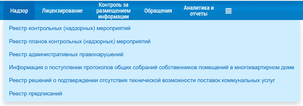 При нажатии на пункт горизонтального навигационного меню Надзор отображается контекстное меню раздела.