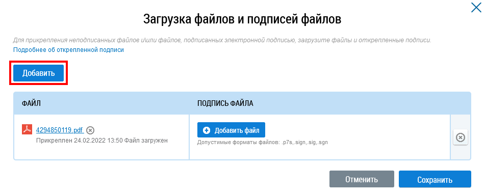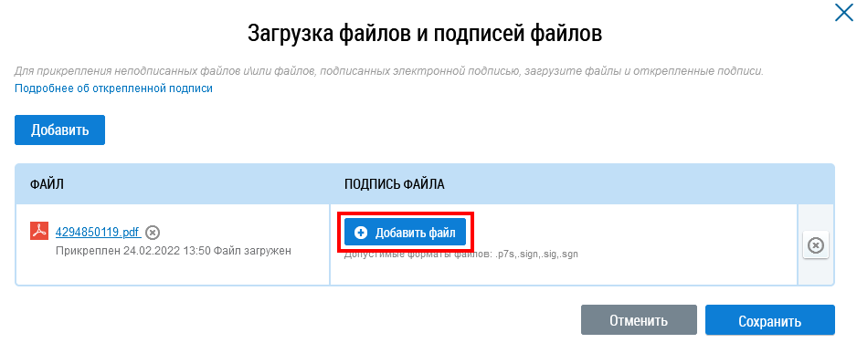 Выберите документ и дождитесь окончания его загрузки. После загрузки документа становится возможной загрузка электронной подписи. Нажмите на кнопку Добавить файл в столбце Подпись файла для прикрепления электронной подписи.