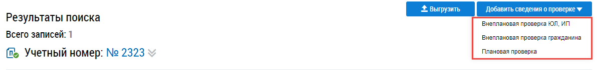 Для добавления сведений о контрольном (надзорном) мероприятии в Реестре контрольных (надзорных) мероприятий нажмите на кнопку Добавить информацию о проверке и выберите необходимый пункт меню.