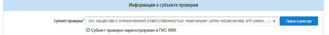 В блоке Информация о субъекте проверки заполните поле Субъект проверки, выбрав значение из выпадающего списка или нажав на кнопку Поиск в реестре и выбрав значение из справочника. В случае, если субъект проверки зарегистрирован/не зарегистрирован в ГИС ЖКХ, отображаются соответствующие сообщения.