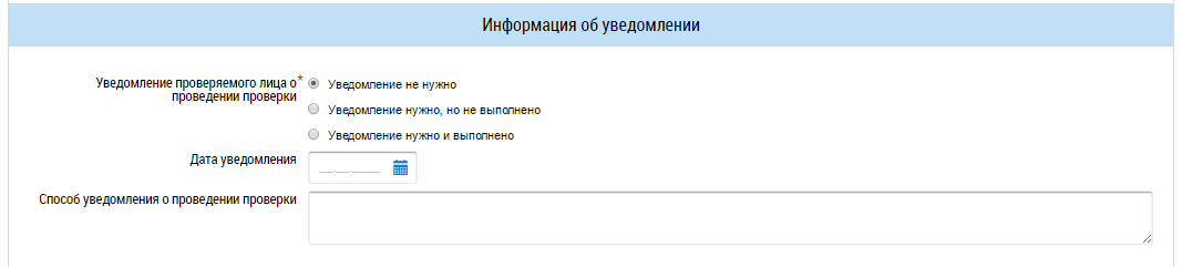 При установлении флажка в поле Уведомление нужно и выполнено поля Дата уведомления и Способ уведомления о проведении проверки становятся обязательными.