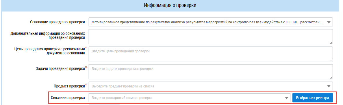 Для заполнения поля Связанная проверка необходимо выбрать не аннулированное контрольное (надзорное) мероприятие в рамках того же КО и субъекта. Для поиска связанного контрольного (надзорного) мероприятия нажмите на кнопку Выбрать из реестра.