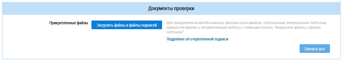 Для добавления документа контрольного (надзорного) мероприятия нажмите на кнопку Загрузить файлы и файлы подписей в блоке Документы проверки.