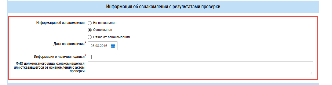 В блоке Информация о результате проверки в поле Вид документа результата проверки выберите необходимое значение из выпадающего списка. Для заполнения остальных обязательных полей в данном блоке введите необходимую информацию. Поле Продолжительность проведения проверки, рабочих дней необязательно для заполнения. Поле Продолжительность проведения проверки, рабочих часов обязательно для заполнения в случае, если проверка внеплановая и не зарегистрирована в едином реестре проверок. Для заполнения поля Результаты проверки установите переключатель в зависимости от выявления или отсутствия нарушений. Прикрепите документы, подтверждающие указанную выше информацию: акт о проведении контрольного (надзорного) мероприятия или другой документ, содержащий результат его проведения, нажав на кнопку Загрузить файлы и файлы подписей. В блоке Информация об ознакомлении с результатами проверки установите переключатель в одном из полей информации об ознакомлении. При установлении значения Ознакомлен, обязательными полями становятся Дата ознакомления и Информация о наличии подписи. При наличии подписи установите флажок в соответствующее поле.