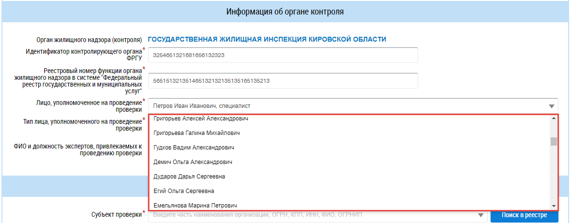 Для заполнения обязательного поля Лицо, уполномоченное на проведение проверки выберите значение из выпадающего списка.