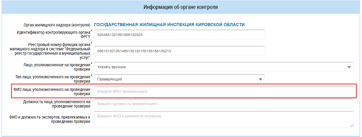 В случае выбора варианта Указать вручную отображается дополнительное поле ФИО лица, уполномоченного на проведение проверки.