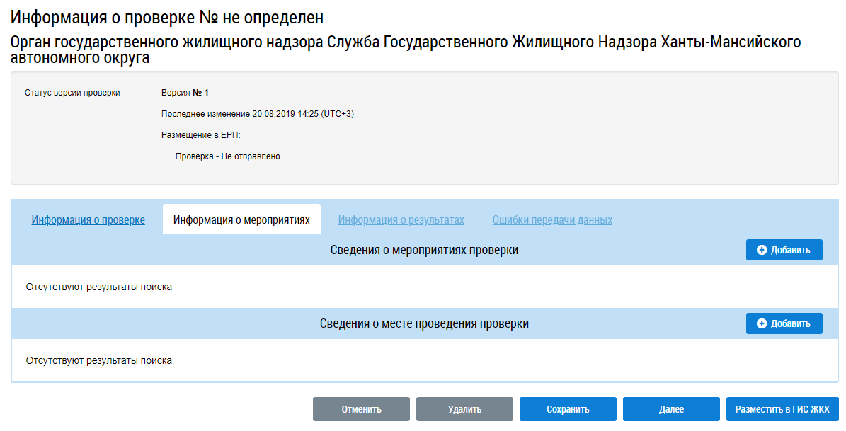 Для сохранения или размещения информации о контрольном (надзорном) мероприятии без перехода к добавлению информации о мероприятиях нажмите на кнопку Сохранить или Разместить в ГИС ЖКХ.