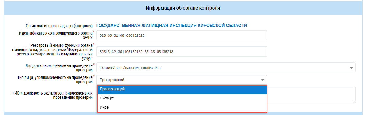 Для заполнения поля Тип лица, уполномоченного на проведение проверки выберите значение из выпадающего списка.
