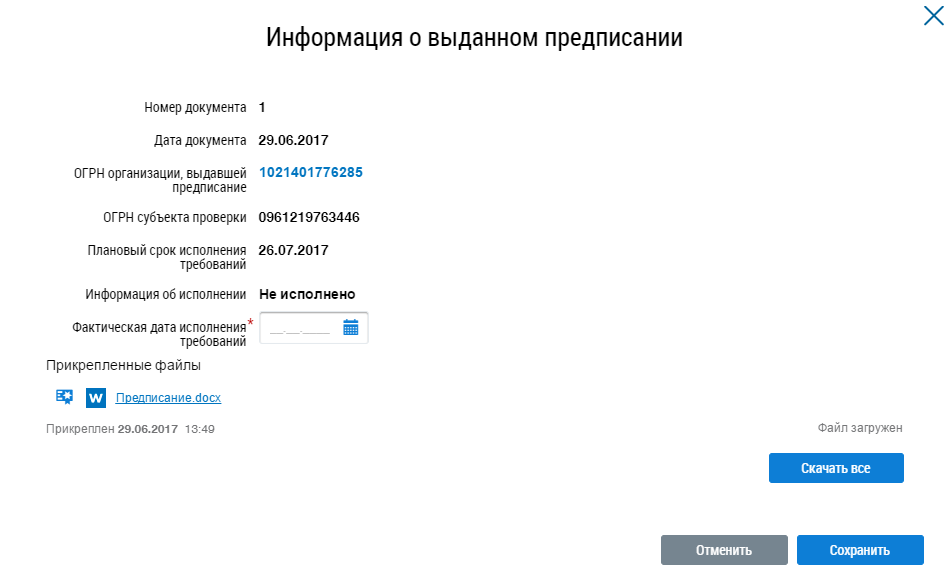 Заполните поле Фактическая дата исполнения требований и нажмите на кнопку Сохранить. В блоке Информация о выданных предписаниях статус предписания изменяется на Исполнено.