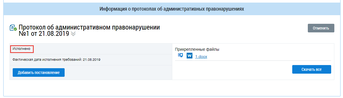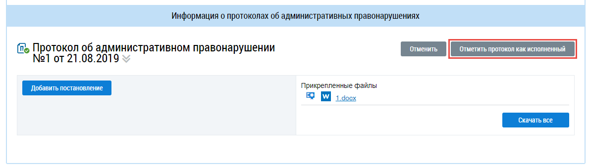 Для размещения информации об исполнении протокола о правонарушениях в соответствующем блоке нажмите на кнопку Отметить протокол как исполненный.