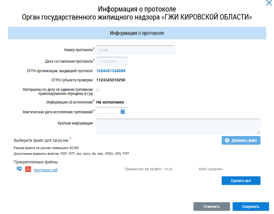 Заполните поле Фактическая дата исполнения требований и нажмите на кнопку Сохранить. В блоке Информация о протоколах об административных правонарушениях статус предписания изменяется на Исполнено.
