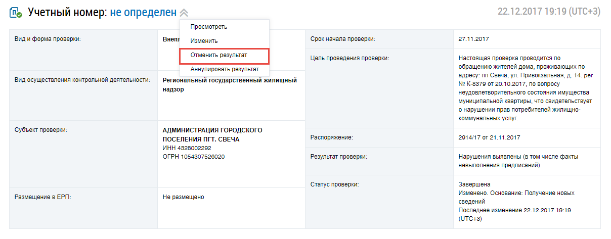 Для отмены результатов завершенного контрольного (надзорного) мероприятия в статусе Завершена выберите пункт контекстного меню Отменить результат.