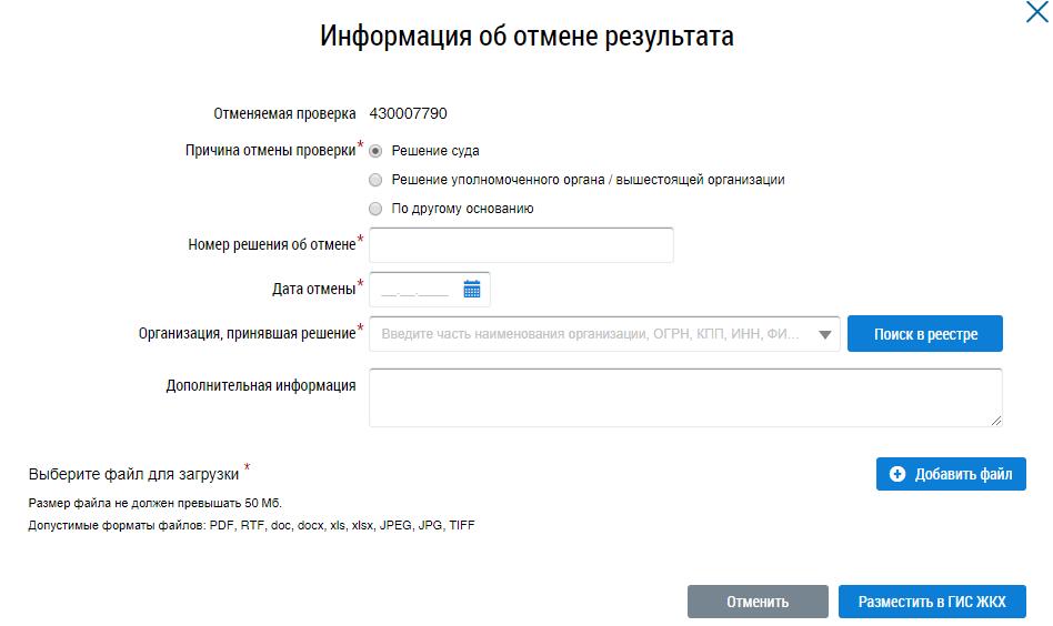 Прикрепите файл, подтверждающий информацию об отмене контрольного (надзорного) мероприятия, нажав на кнопку Добавить файл. Проверьте корректность введенных данных и нажмите на кнопку Разместить в ГИС ЖКХ. Подтвердите действие.