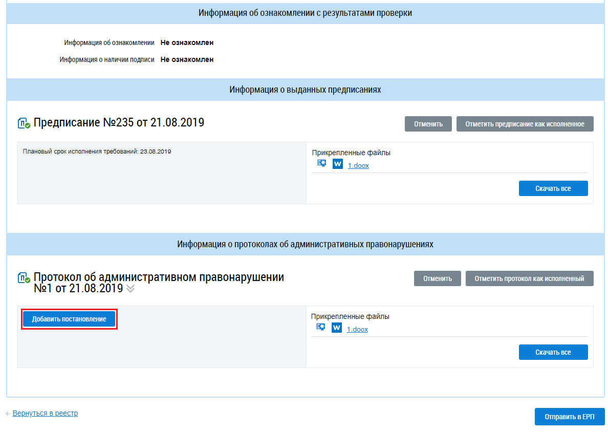 Добавление постановления