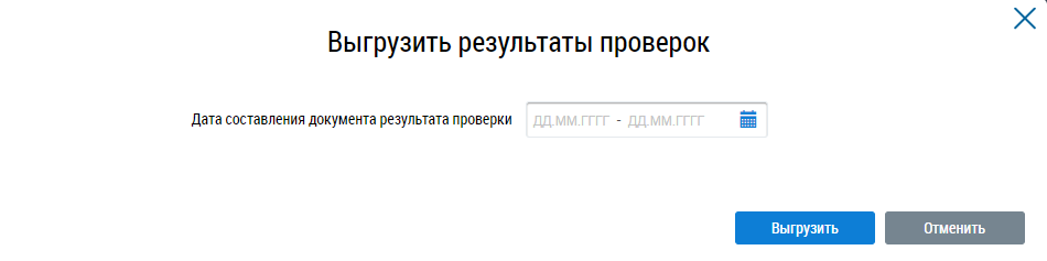 Заполните поле Дата составления документа результата проверки, выбрав диапазон дат из календаря, и нажмите на кнопку Выгрузить. Отображается сообщение об отправке файла в обработку. Для просмотра файла перейдите в раздел Реестр статусов обработки файлов.