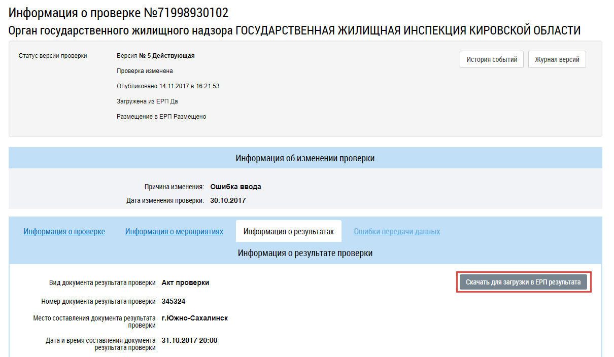 Для экспорта результата конкретного планового контрольного (надзорного) мероприятия перейдите на вкладку Информация о результате в его карточке. Данное действие доступно для действующей версии планового не аннулированного контрольного (надзорного) мероприятия с не аннулированным результатом, размещенной в ЕРП1.