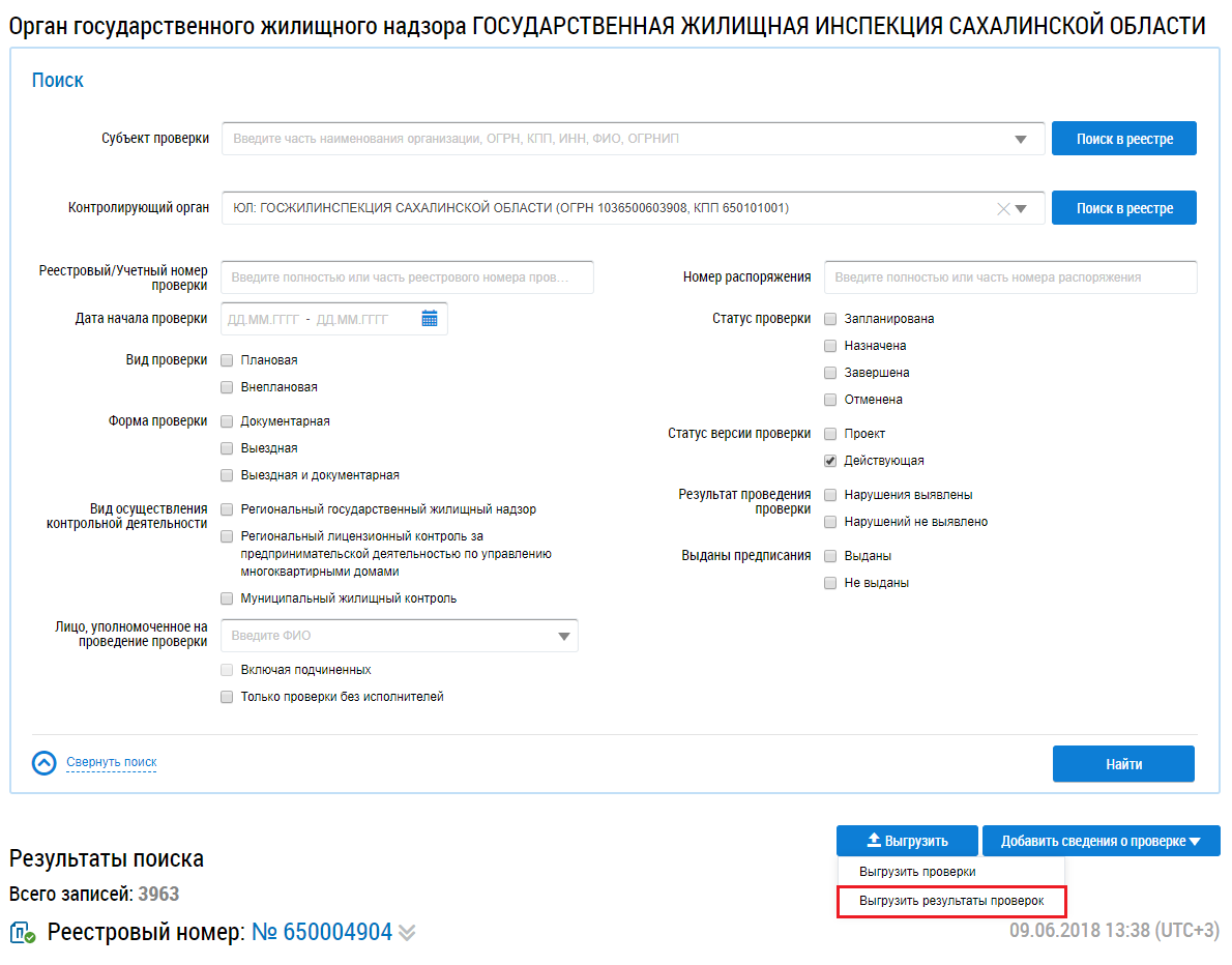 Для экспорта результатов плановых контрольных (надзорных) мероприятий за определенный период нажмите на кнопку Выгрузить и выберите пункт контекстного меню Выгрузить результаты проверок.