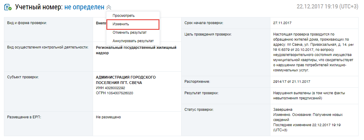 Для внесения изменения в размещенное контрольное (надзорное) мероприятие выберите пункт контекстного меню Изменить для контрольного (надзорного) мероприятия в статусе Завершена.