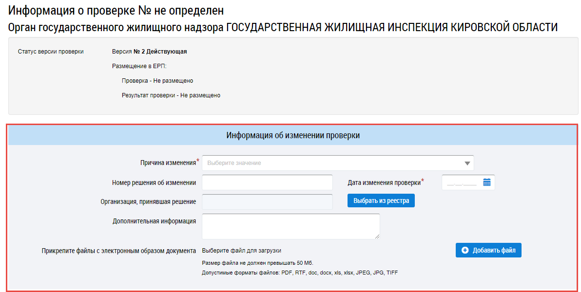 Для заполнения поля Причина изменения выберите значение из выпадающего списка. Внесите информацию в поля Номер решения об изменении и Дата изменения проверки. Для выбора организации, принявшей решение, нажмите на кнопку Выбрать из реестра. При необходимости заполните поле Дополнительная информация и прикрепите файлы с электронным образом документа, нажав на кнопку Добавить файл.