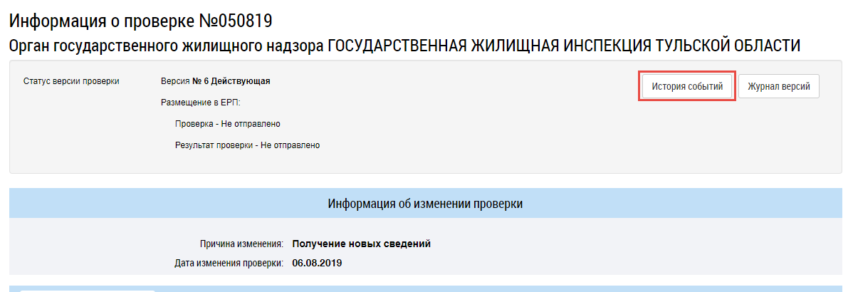 Для просмотра истории изменения контрольного (надзорного) мероприятия перейдите в карточку контрольного (надзорного) мероприятия и в верхней части страницы нажмите на кнопку История событий.
