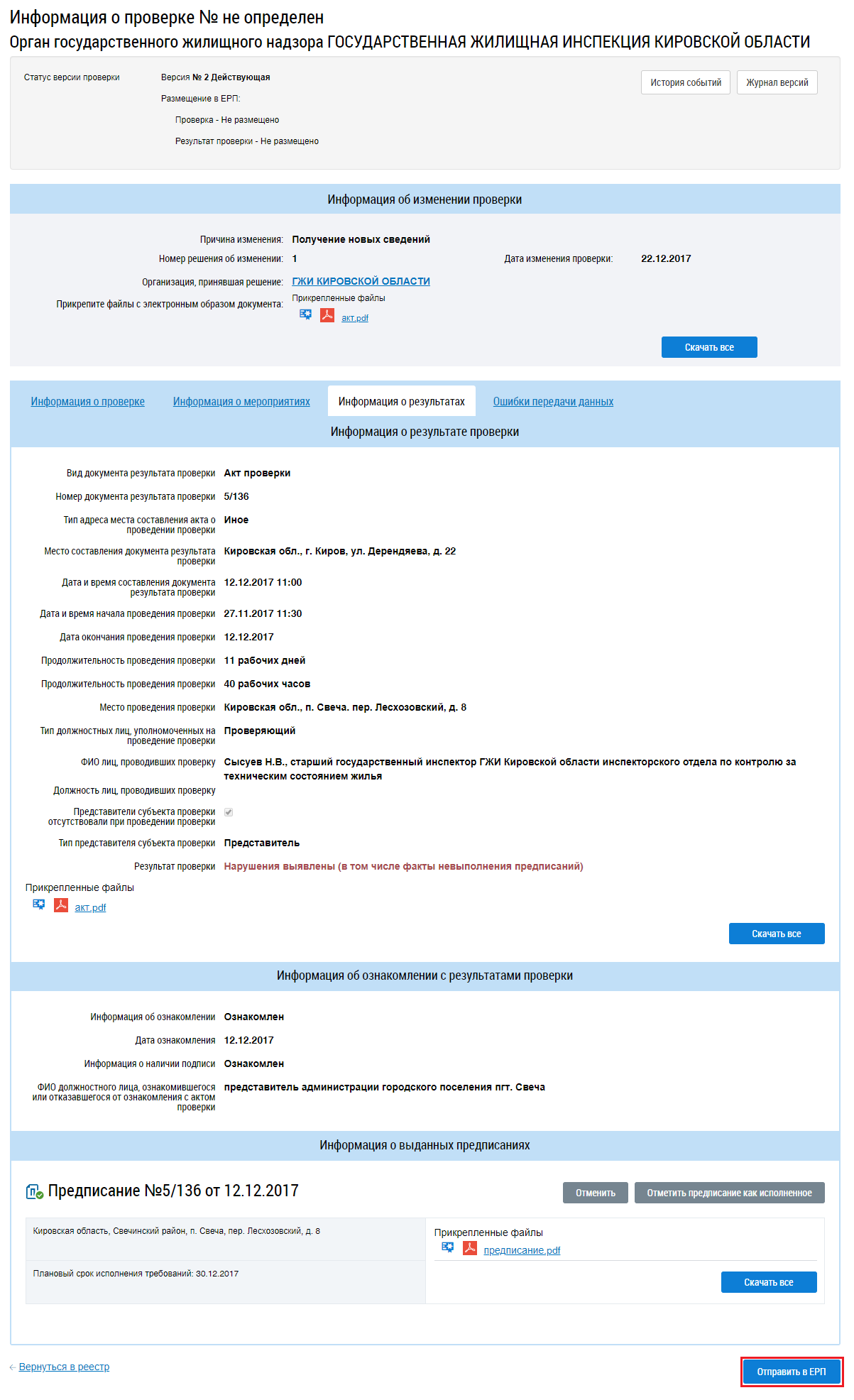 Информация о внеплановом контрольном (надзорном) мероприятии повторно отправлена в ФГИС ЕРП.