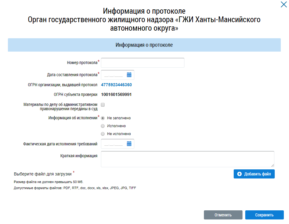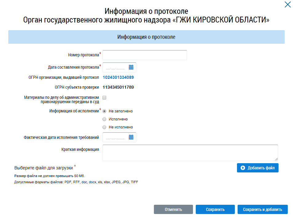 Заполните обязательные поля в окне (при установке флага Материалы по делу об административном правонарушении переданы в суд отображаются дополнительные поля, обязательные для заполнения), добавьте файл протокола и нажмите на кнопку Сохранить. Для сохранения сведений о результатах проведении внепланового контрольного (надзорного) мероприятия и размещения его в Реестре проверок нажмите на кнопку Разместить в ГИС ЖКХ.