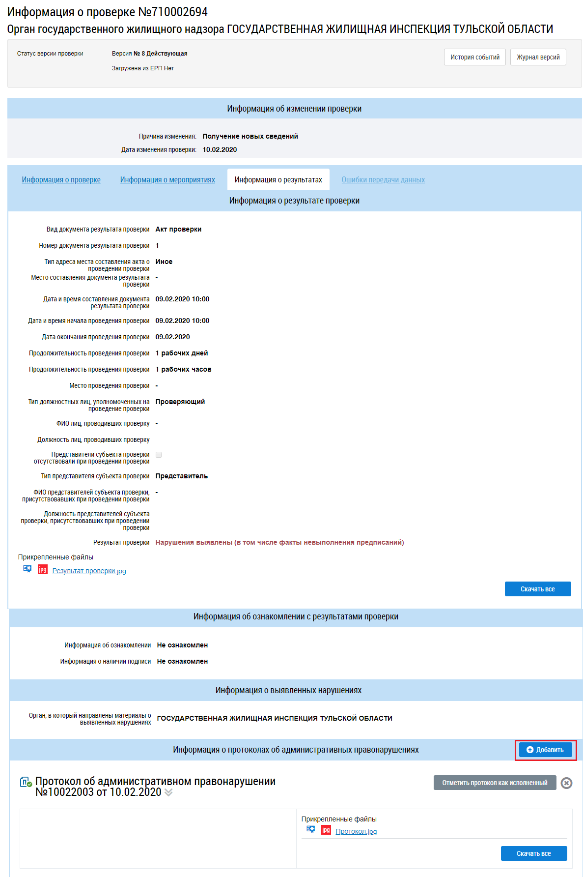 Добавленный протокол отображается в блоке Информация о протоколах об административных правонарушениях.