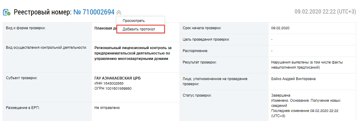 Действие добавления протоколов доступно для внеплановых контрольных (надзорных) мероприятий, созданных ОМЖК. Для этого выберите пункт контекстного меню Добавить протокол.