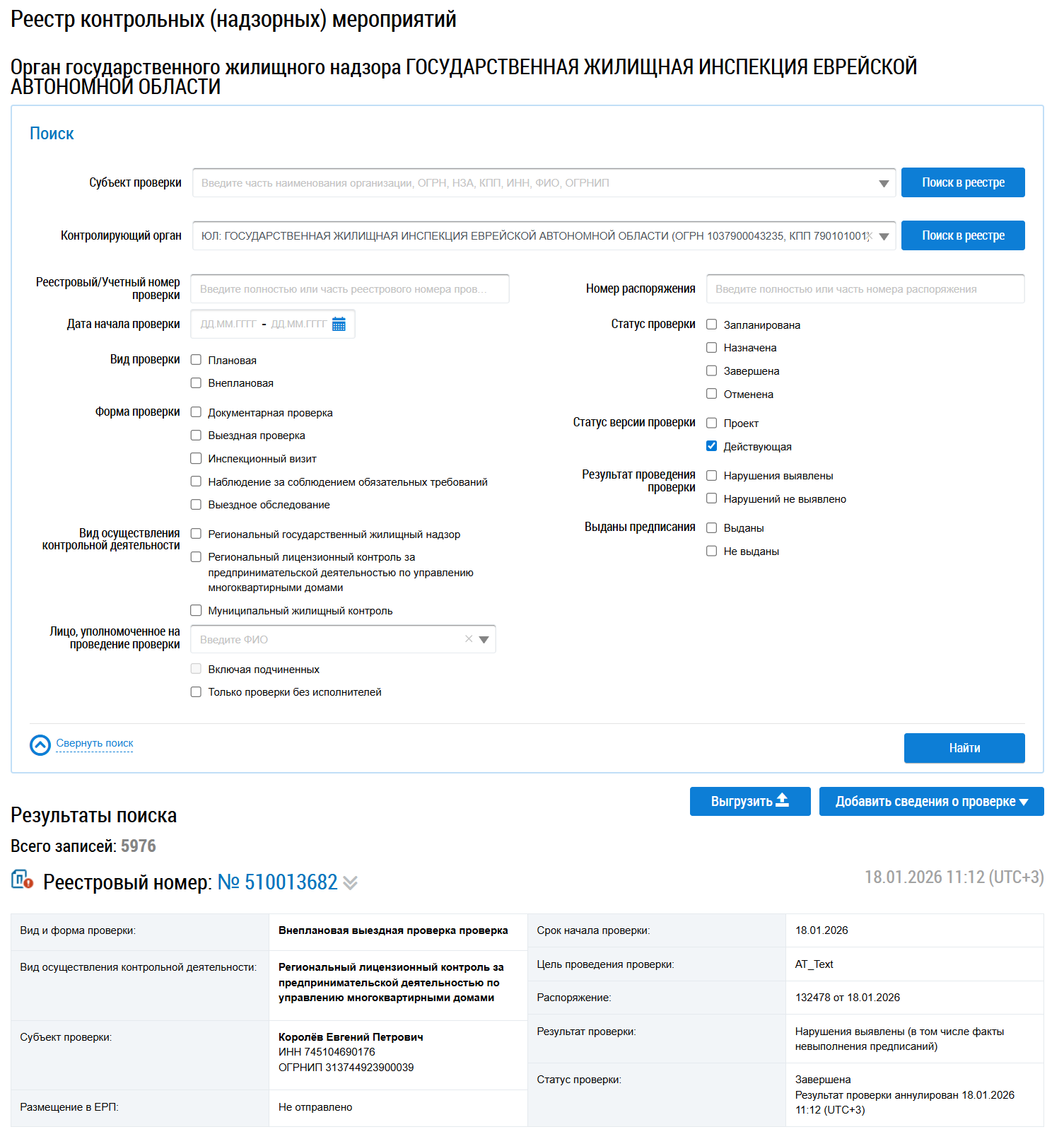 Система позволяет размещать информацию о проведении ОГЖН внеплановых контрольных (надзорных) мероприятий юридических лиц, индивидуальных предпринимателей и граждан. Кроме того, Система позволяет просматривать информацию о контрольных (надзорных) мероприятий, размещенных органами муниципального жилищного контроля. Работа с реестром контрольных (надзорных) мероприятий доступна пользователям с правом доступа «Доступ на просмотр реестра планов проведения контрольных (надзорных) мероприятий и реестра контрольных (надзорных) мероприятий».