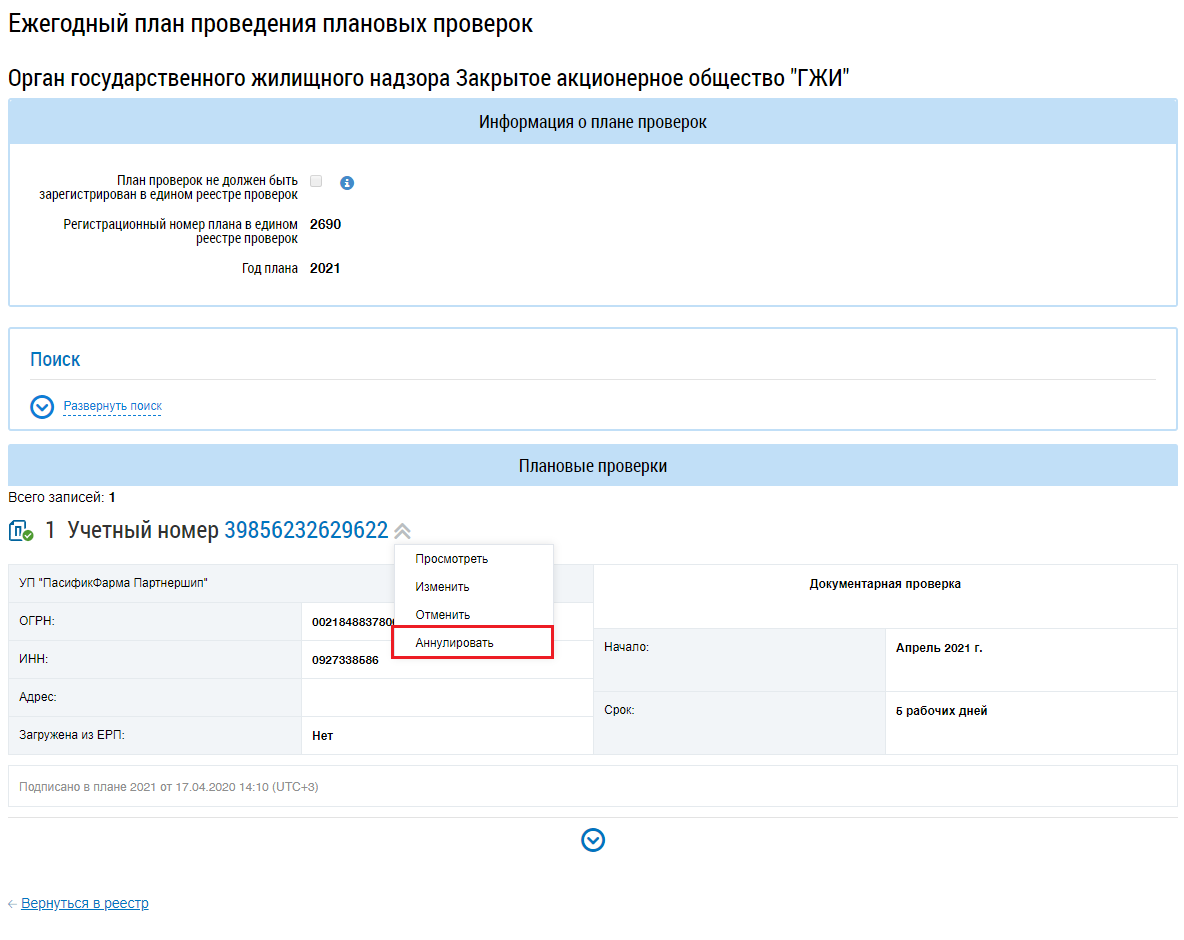 Аннулирование контрольного (надзорного) мероприятия в плане контрольных (надзорных) мероприятий
