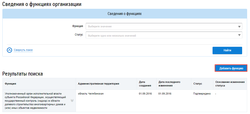 Для добавления функции организации нажмите на кнопку Добавить функцию на странице Сведения о функциях организации.