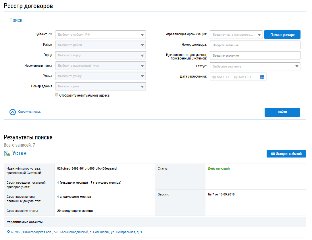 Для просмотра информации об уставах ЖСК перейдите на страницу Реестр договоров. Для этого в разделе Объекты управления горизонтального навигационного меню выберите пункт Договоры управления .