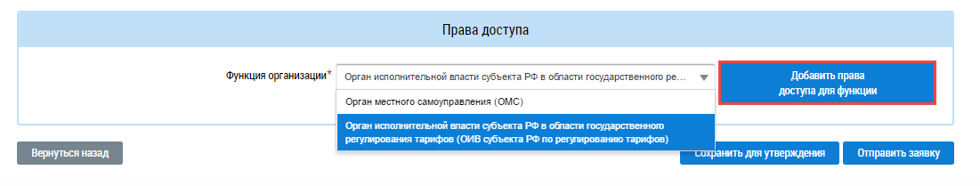 Заполните блок Права доступа. В случае наличия у организации нескольких функций выберите в выпадающем списке поля Функция организации необходимое значение и нажмите на кнопку Добавить права доступа для функции. Если у организации одна функция, данное поле не отображается.