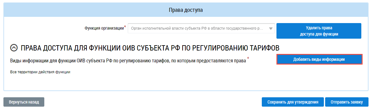 Укажите виды информации, по которым предоставляются права. Для добавления видов информации нажмите на кнопку Добавить виды информации.