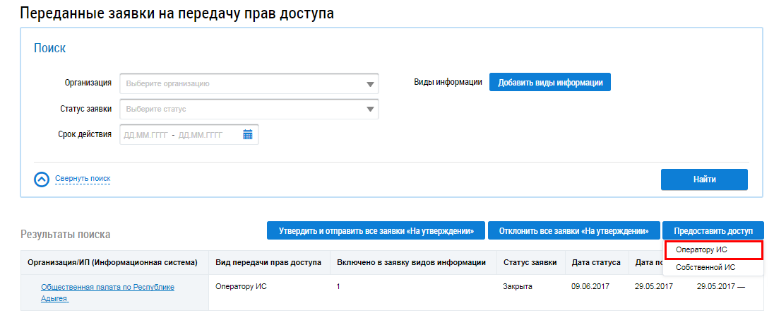 Для формирования заявки на предоставление прав доступа Оператору ИС нажмите на кнопку Предоставить доступ на странице Переданные заявки на передачу прав доступа и выберите в контекстном меню пункт Оператору ИС.