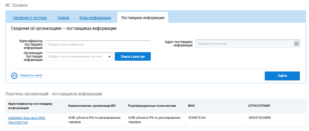 В случае необходимости воспользуйтесь блоком поиска организации. Установите необходимые параметры поиска и нажмите на кнопку Найти. В блоке Перечень организаций-поставщиков информации отобразятся организации, соответствующие поисковому запросу.