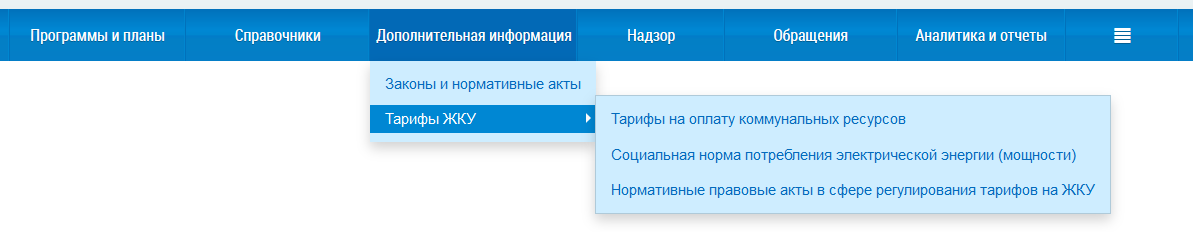 Раздел Дополнительная информация содержит функционал работы с тарифами ЖКУ, законами и нормативными актами в сфере регулирования тарифов. Данный раздел содержит следующие пункты: