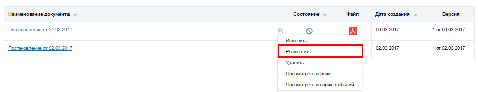 Для размещения на сайте ГИС ЖКХ документа в статусе Документ не размещен раскройте контекстное меню документа и выберите пункт Разместить.