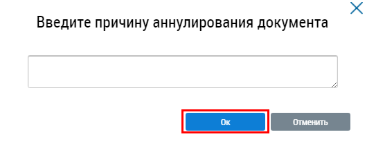 В отобразившемся окне введите причину аннулирования документа и нажмите на кнопку Ок.