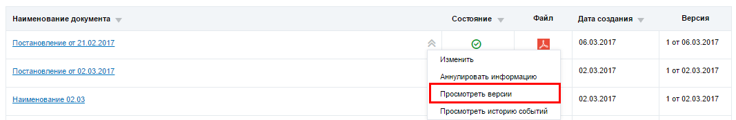 Для просмотра версий документа выберите пункт контекстного меню Просмотреть версии.