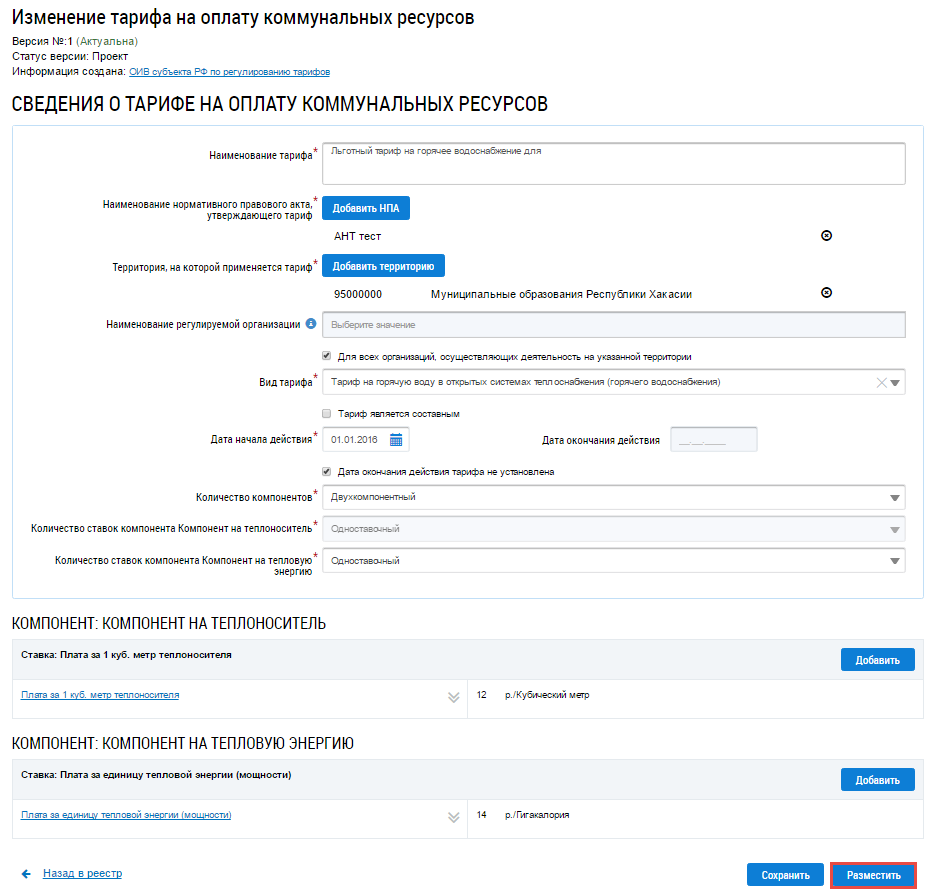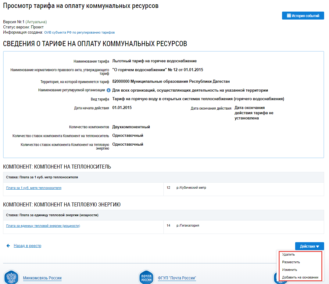 Либо нажмите не кнопку Действия на странице Просмотр тарифа на оплату коммунальных ресурсов и выберите пункт меню Разместить.
