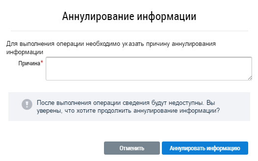 Укажите причину аннулирования информации в текстовом поле и нажмите на кнопку Аннулировать информацию.