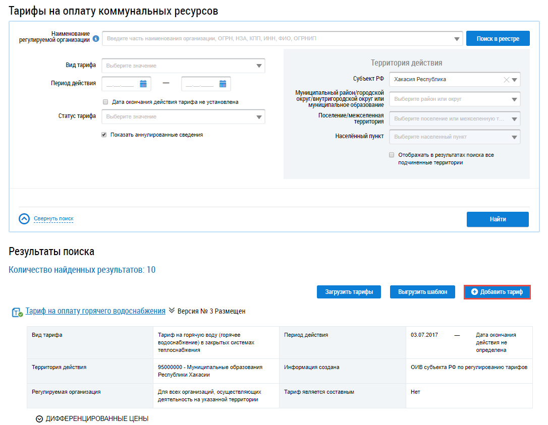 Для добавления тарифа на оплату коммунальных ресурсов нажмите на кнопку Добавить тариф на странице Тарифы на оплату коммунальных ресурсов.