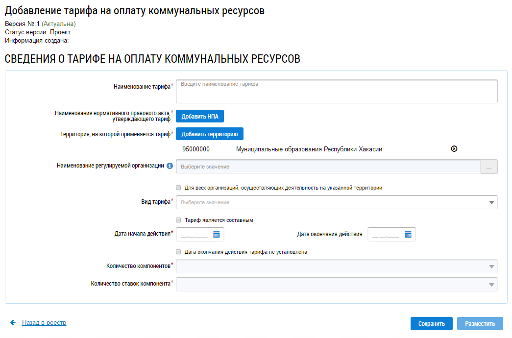 Отображается страница Добавление тарифа на оплату коммунальных ресурсов.