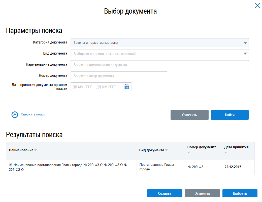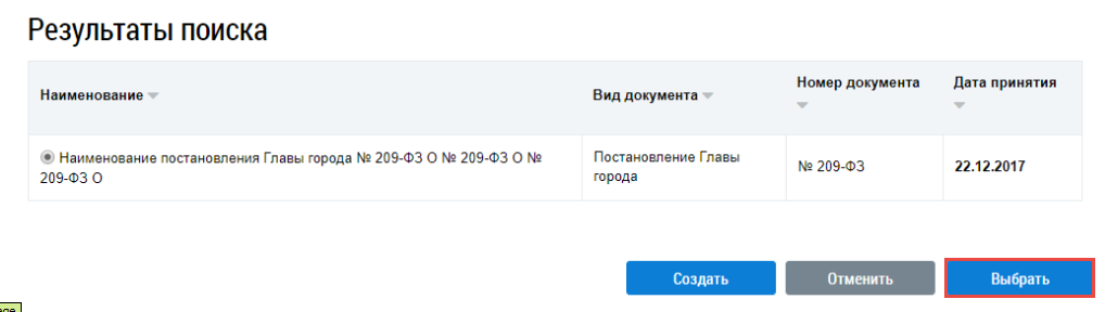 В блоке результатов поиска отображаются документы, соответствующие параметрам поиска. Установите переключатель напротив искомого документа и нажмите на кнопку Выбрать.