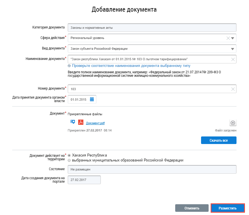 После заполнения полей формы добавления документа нажмите на кнопкуРазместить.