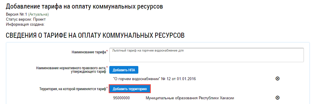 После выбора нормативного акта, утверждающего добавляемый тариф, Система отображает страницу Добавление тарифа на оплату коммунальных ресурсов с внесенными ранее сведениями.