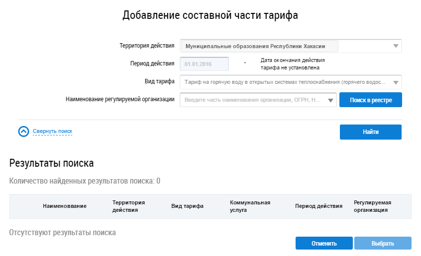 Поиск составной части тарифа возможен по одному или нескольким параметрам. Нажмите на кнопку Найти.