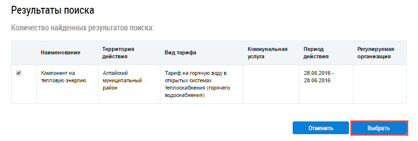В блоке результатов поиска отображаются составные части тарифов, соответствующие параметрам поиска. Установите флажок напротив необходимого значения и нажмите на кнопку Выбрать.