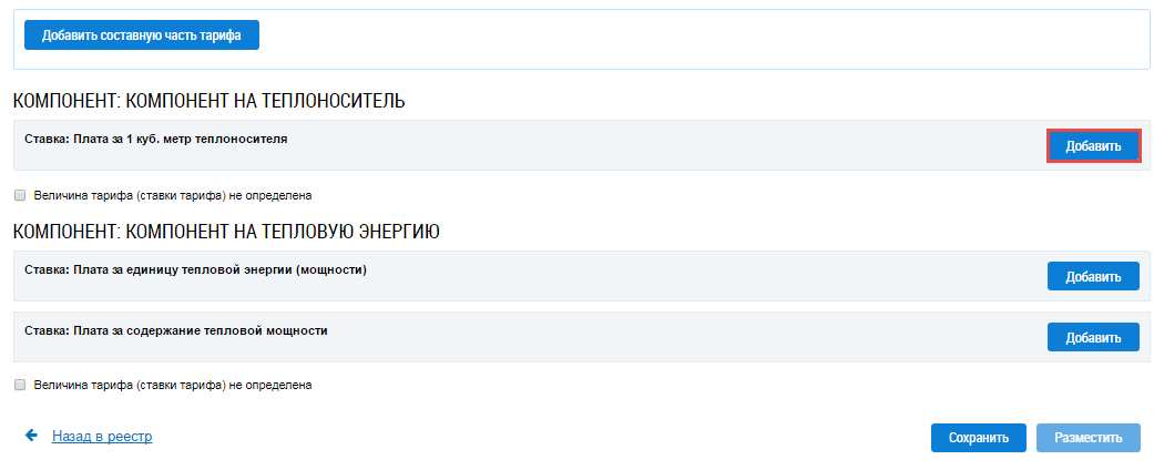 Далее на странице Добавление тарифа на оплату коммунальных ресурсов добавьте описание дифференцированной цены к тарифу. Для этого нажмите на кнопку Добавить1.
